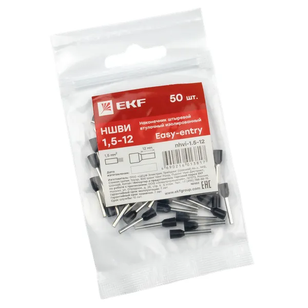 Наконечник штыревой втулочный изолированный ншви 1.5-12 (50шт) EKF NHVI-1.5-12