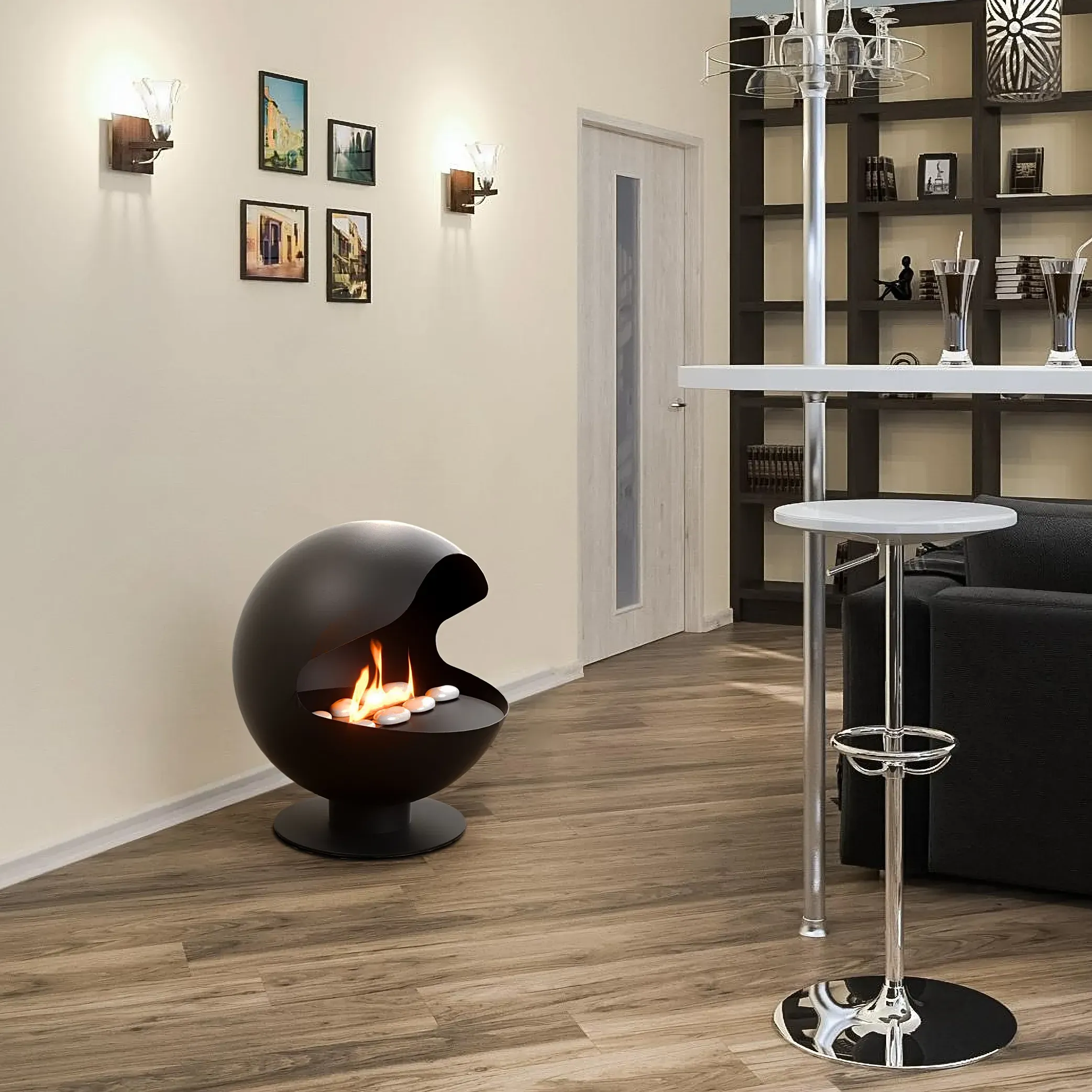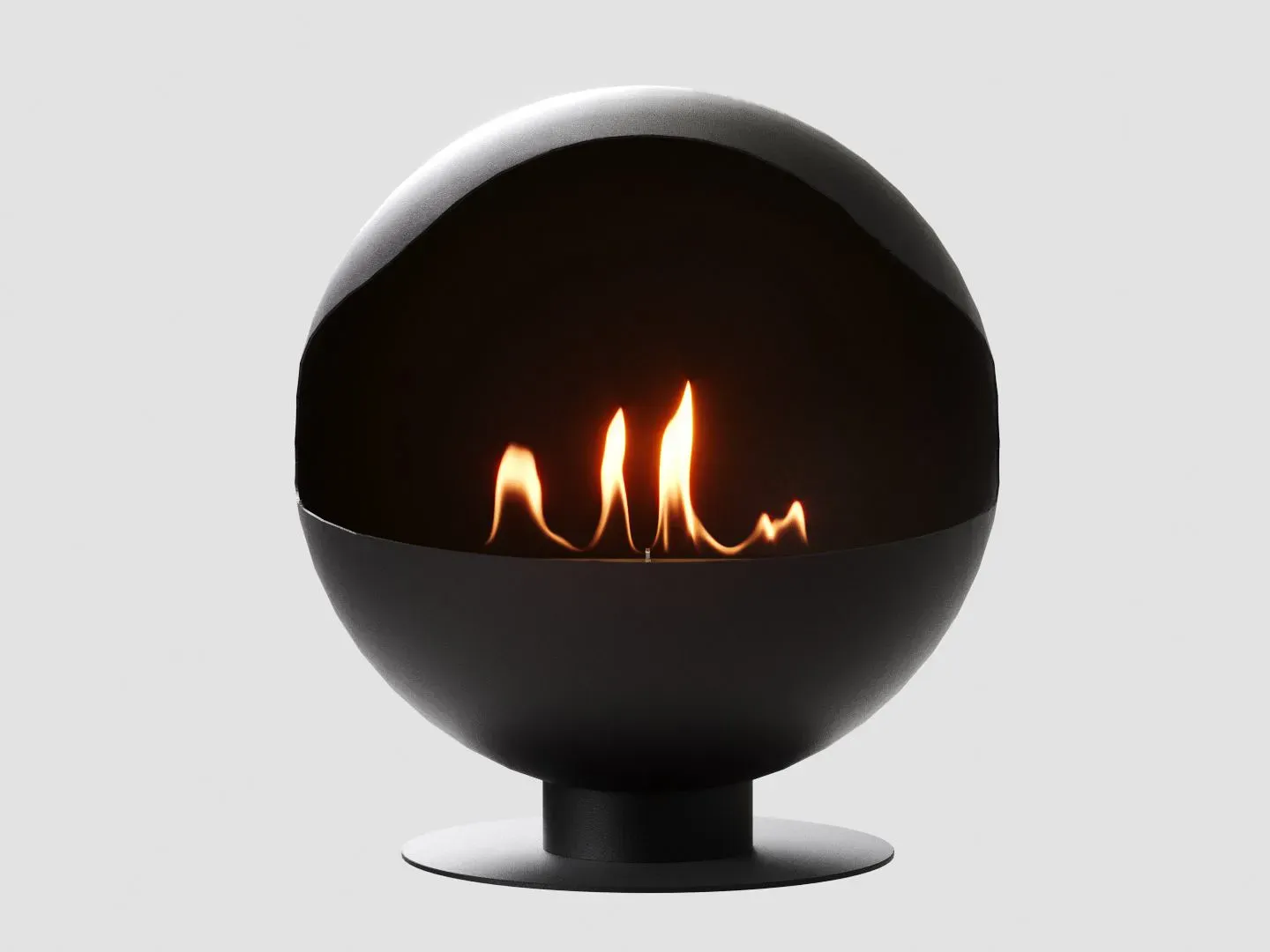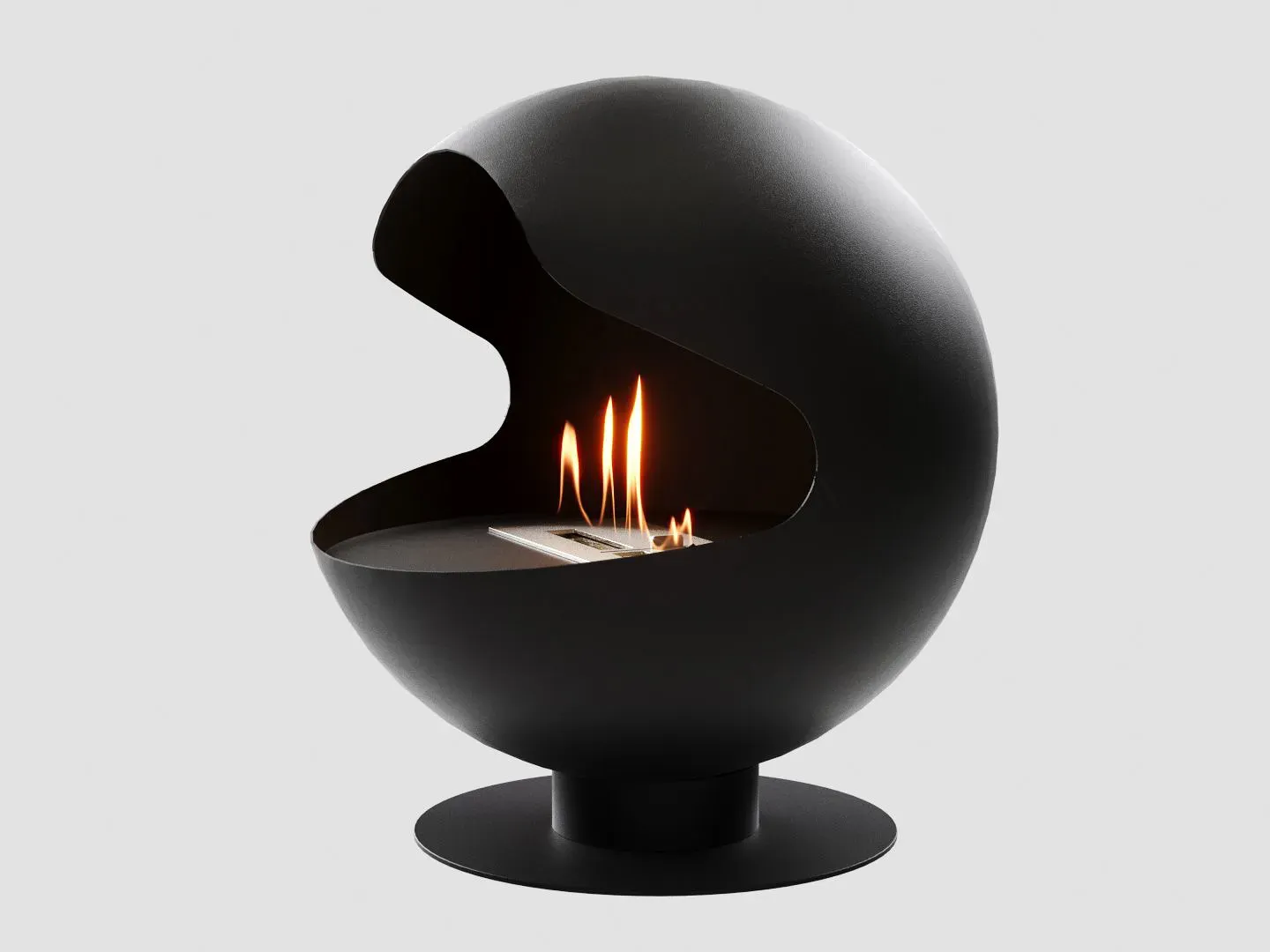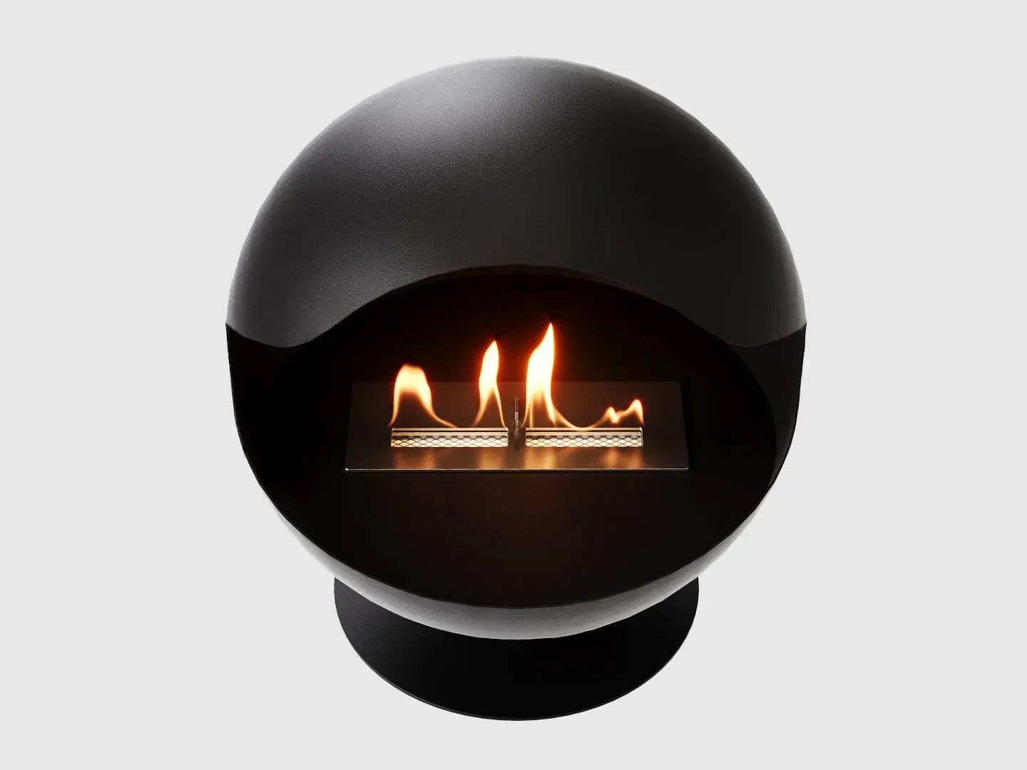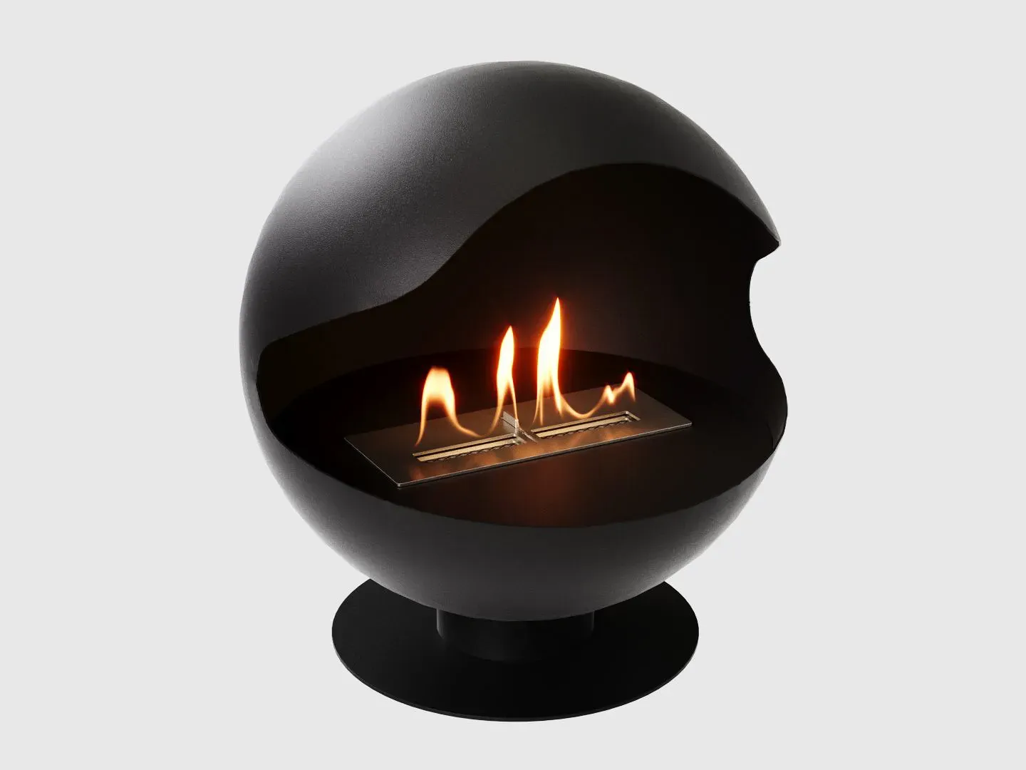 Напольный биокамин исполнен в благородном черном цвете и имеет сферическую форму, устремленную к совершенству. Изящные изгибы стального корпуса подчеркивают грациозность живого огня, таящегося внутри этой жемчужины.