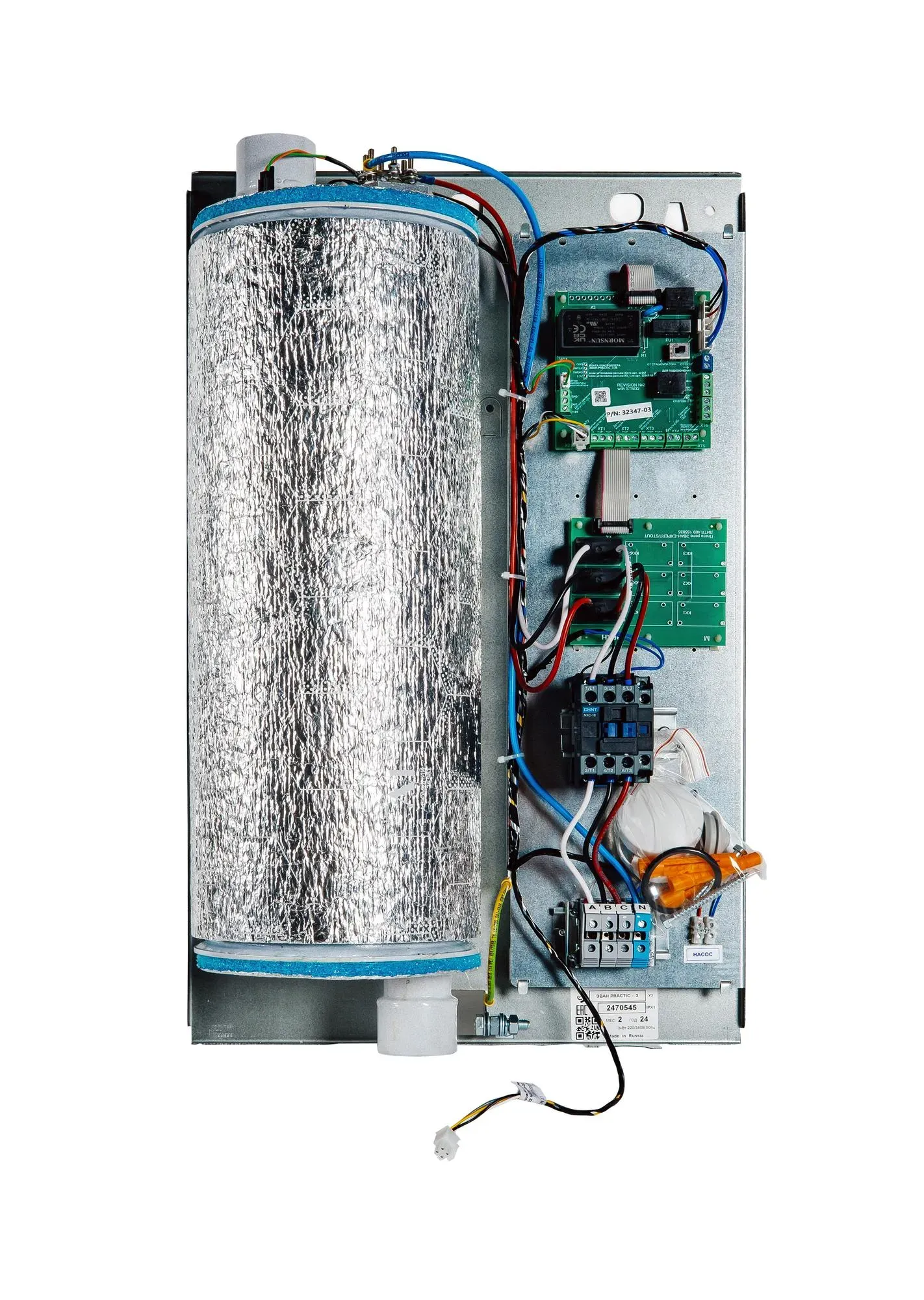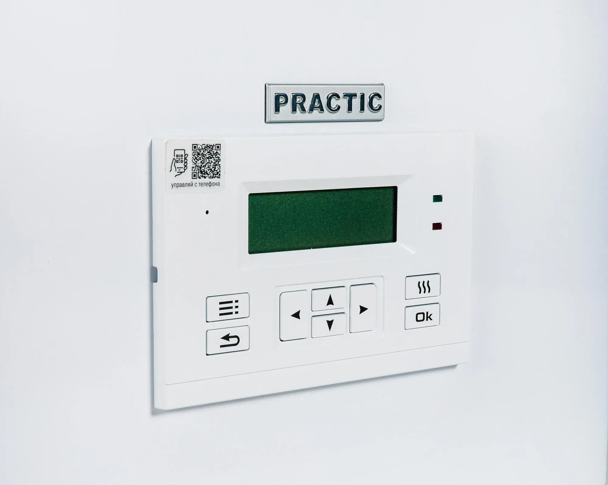 Управление котлом основано на современном уникальном погодозависимом алгоритме, настройка может происходить по температуре теплоносителя, комнатной и уличной температурам. Лаконичное меню с крупным шрифтом и быстрым доступом к функциям, встроенный WI-FI. Есть возможность программирования суточной и недельной температуры воздуха в отапливаемом помещении. В конструкционном решении котла надежности отведено особое место. Котел защищен как от сбоев, так и от замерзания. Самодиагностика неисправностей, накопление статистики по энергопотреблению и наличие уникального режима отладки, в рамках которого можно проверить срабатывание каждого из органов управления котла. ЭВАН PRACTIC не является мини-котельной, однако он имеет необходимые разъемы для подключения насоса и функцию управления контуром ГВС.