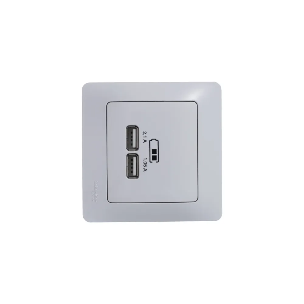Механизм Systeme Electric (ранее Schneider Electric) серии Glossa (цвет белый) розетки с двумя разъёмами USB с выходными напряжением 5 В постоянного тока и выходами с номинальным током по 2,1 А. Предназначен для зарядки мобильных устройств - телефоны, планшетные компьютеры, mp3/mp4 плееры. Может заряжать одно или два устройства одновременно. Выполнен из материала PС+ASA, стойкого к УФ-излучению и появлению царапин.