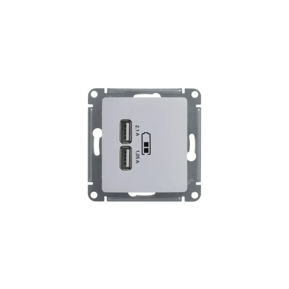 Механизм Systeme Electric (ранее Schneider Electric) серии Glossa (цвет белый) розетки с двумя разъёмами USB с выходными напряжением 5 В постоянного тока и выходами с номинальным током по 2,1 А. Предназначен для зарядки мобильных устройств - телефоны, планшетные компьютеры, mp3/mp4 плееры. Может заряжать одно или два устройства одновременно. Выполнен из материала PС+ASA, стойкого к УФ-излучению и появлению царапин.