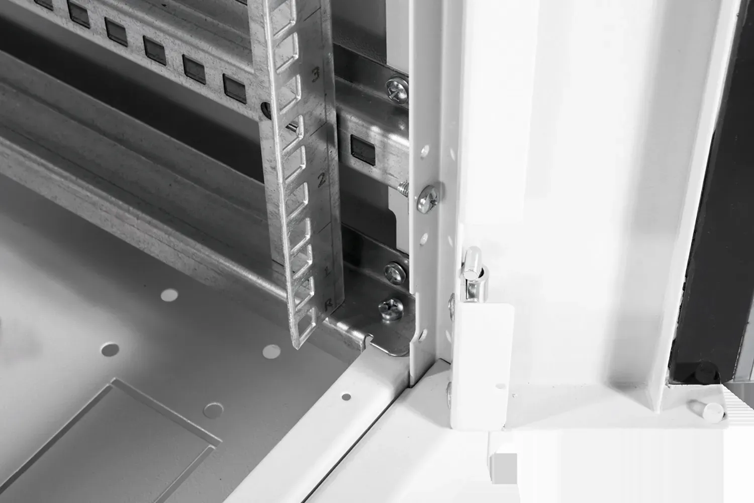 Шкаф имеет 4 оцинкованные вертикальные направляющие, регулируемые по глубине. Система заземления входит в стандартную комплектацию.