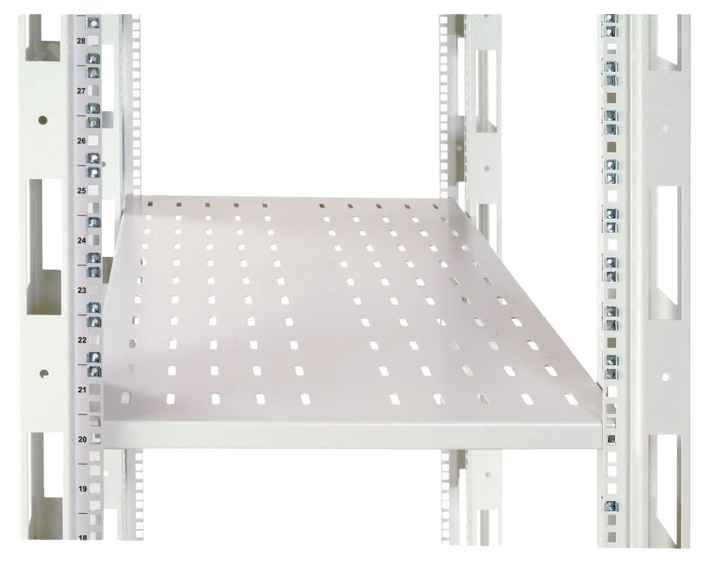 Перфорированные полки серии СВ и СВ-У, необходимый атрибут для размещения оборудования в 19 шкафах или стойках. Полки имеют четырехточечную фиксацию к вертикальным направляющим, что обеспечивает надежную фиксацию и что обеспечивает безопасное размещение оборудования любого класса и категории. Благодаря перфорации, потоки воздуха могут с легкостью проходить сквозь полки, что обеспечивает хорошую вентиляцию и охлаждение установленного оборудования. Серия СВ допускает максимальную нагрузку до 45 кг, так же есть специальная, усиленная серия СВ-У. В конструкцию этих полок, добавлены специальные ребра жесткости, что позволяет нагружать их до 100 кг. Каждая полка имеет индивидуальную упаковку и крепежный комплект, а для удобной логистики, производитель предусматривает транспортную упаковку по 5 штук