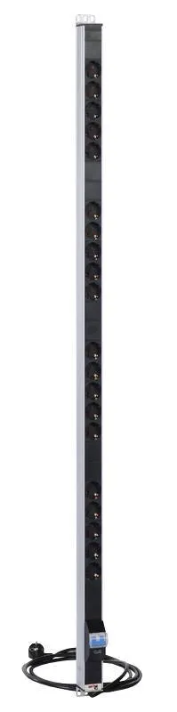 Блок силовых розеток имеет двадцать портов стандарта Schuko, выполнен в анодированном алюминиевом корпусе. Розетки расположены под углом 45%, для удобного подсоединения коленчатых штекеров. Блок имеет автомат защиты 16А. Блок предназначен для установки в шкафы 33-48U. Кабель питания 3 метра. Поставляется в индивидуальной упаковке с комплектом крепежа.