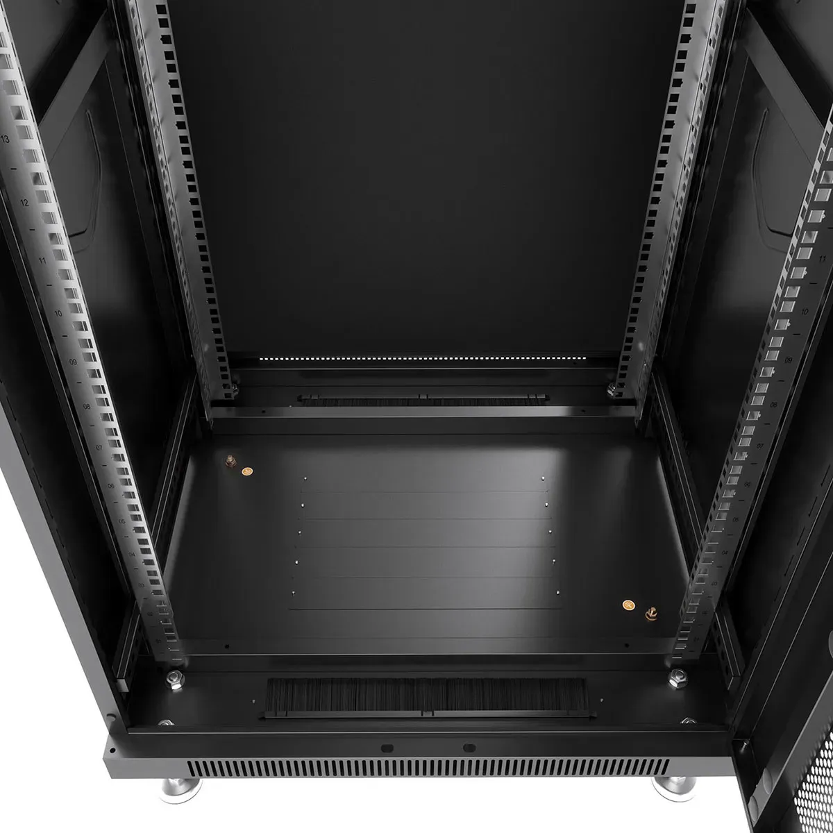 | В днище шкафа 2 щеточных ввода и 5 сьемных заглушек. Крепежный комплект 30шт. (винт+квадратная гайка). | Легко съемные и перенавесные двери | Щеточный ввод и перфорация для вентиляции. |