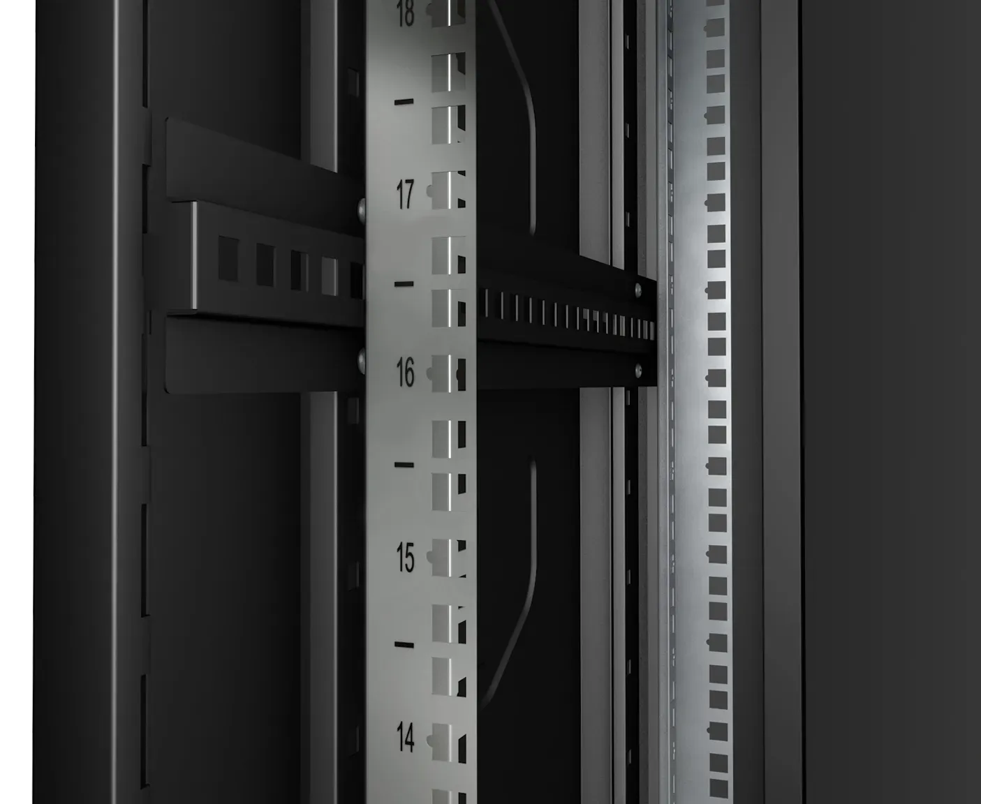 Четыре 19" монтажных L - профиля, имеют юнитовую (U) разметку в соответствии со стандартом DIN 41494-7, глубина установки направляющих может изменяться в зависимости от устанавливаемого оборудования.