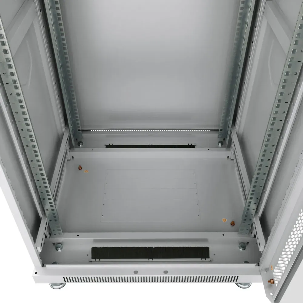 | В днище шкафа 2 щеточных ввода и 5 сьемных заглушек. Крепежный комплект 30шт. (винт+квадратная гайка). | Легко съемные и перенавесные двери | Щеточный ввод и перфорация для вентиляции. |