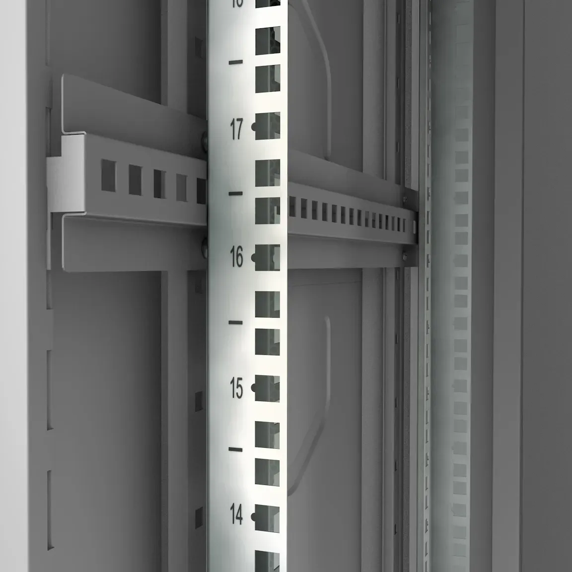 Четыре 19" монтажных L - профиля, имеют юнитовую (U) разметку в соответствии со стандартом DIN 41494-7, глубина установки направляющих может изменяться в зависимости от устанавливаемого оборудования.