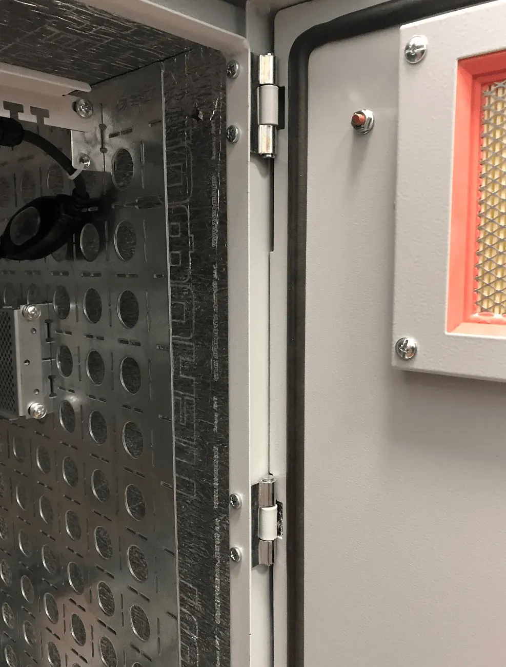 Двери шкафов серии ШТВ-НН имеют перфорацию, которая обеспечивает вентиляцию установленного в них оборудования, но при этом исключает прямой доступ в полость шкафа и попадание в него инородных предметов. В дверь встроена система вентиляции, состоящая из модуля вентиляторного и фильтра. Максимальный угол открытия двери шкафа 120°. На кронштейне, расположенном на верхней петле двери, находится датчик открытия дверей.