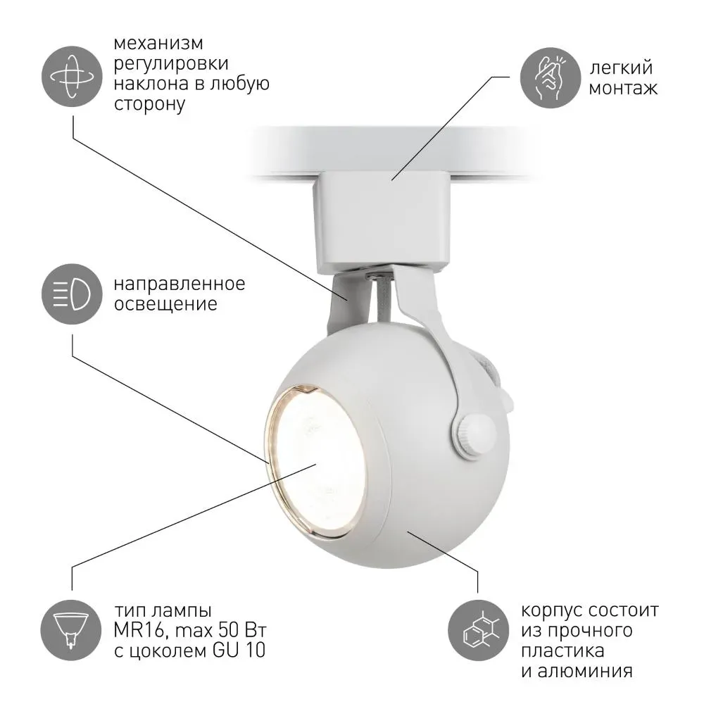 Однофазный трековый светильник под лампу с цоколем GU10. Светильник выполнен из металла, корпус имеет форму шара, установленного на карданный держатель. Плавные формы и многообразие цветов исполнения делают светильник TR35 идеальным кандидатом на роль акцентного света в вашем проекте.