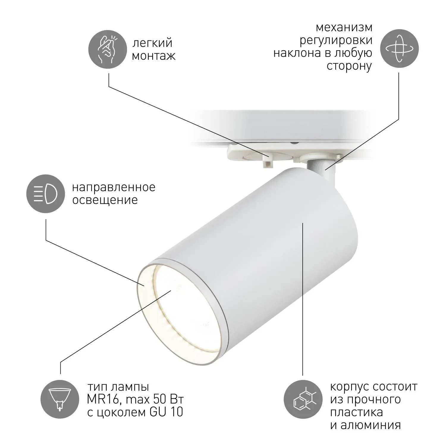 Однофазный трековый светильник под лампу GU10. Особенностью модели является современный утопленный трековый адаптер, который скрыт в шинопроводе и не отвлекает на себя внимание. Также модель комплектуется `Г` образным держателем, который визуально приближает светильник к шинопроводу, делая его эстетически более привлекательным. На тыльной части светильник имеет вентиляционные прорези для отвода горячего воздуха. Максимальная мощность лампы не должна превышать 15W.