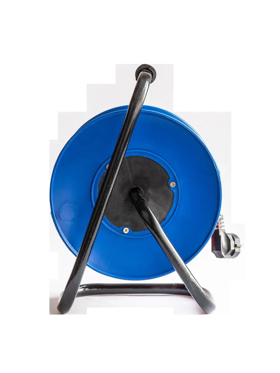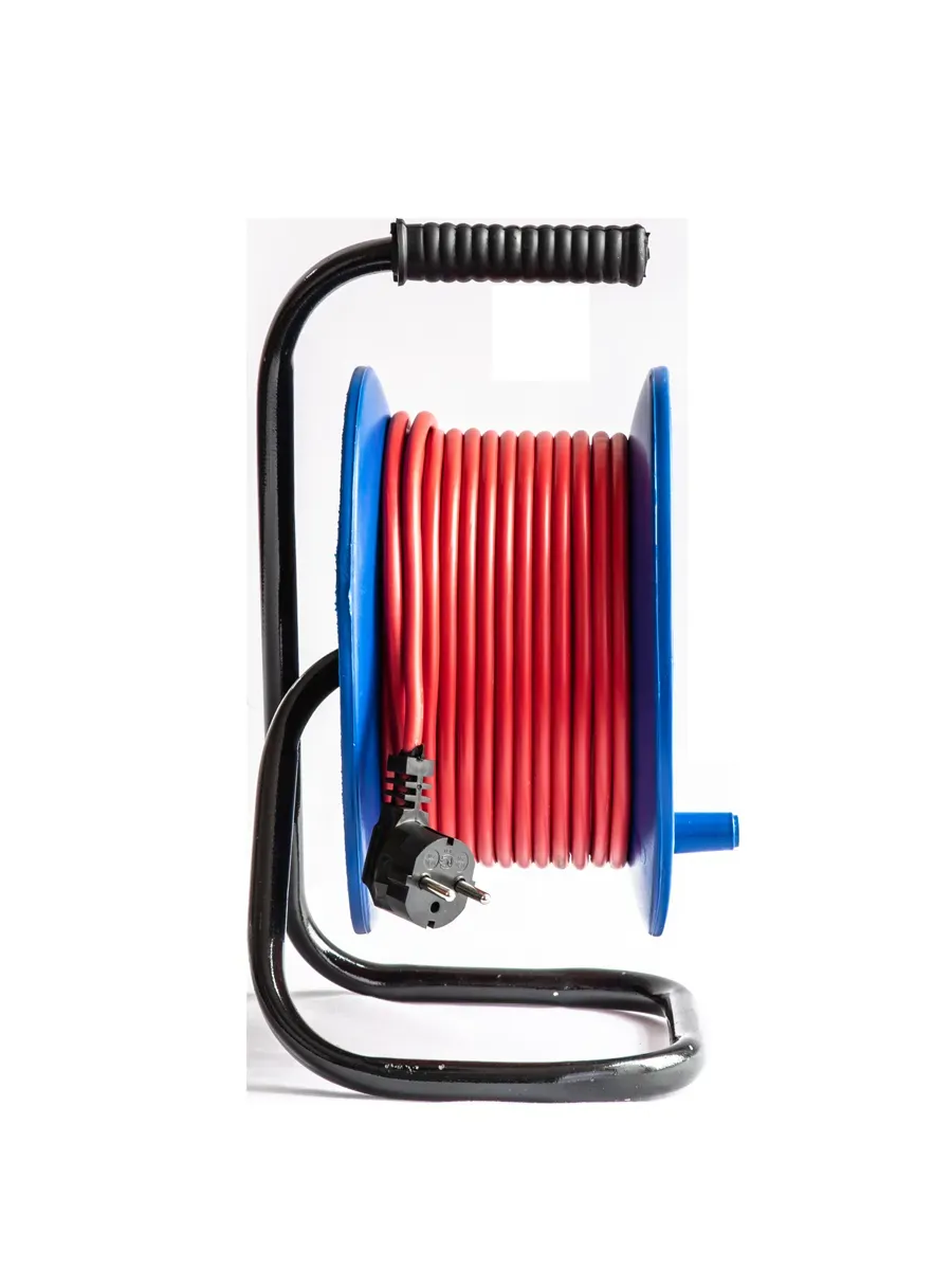 Надежная катушка удлинитель из прочного пластика, c металлической ножкой, провод ПВС без заземления с сечениями 2x1,5 мм и максимальной мощностью нагрузки 1300 Вт.